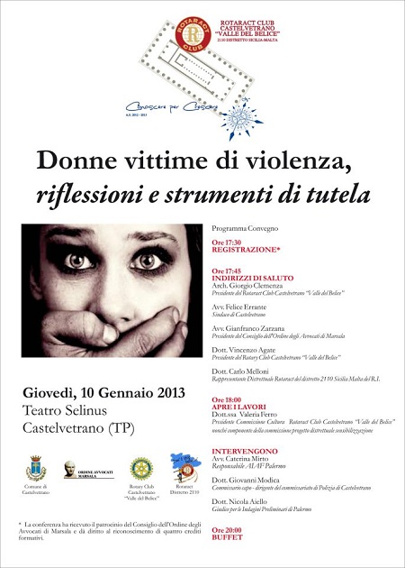 Oggi 10 Gennaio 2013, alle ore 17:30, presso il Teatro Selinus di Castelvetrano, il Rotaract Club di Castelvetrano “Valle del Belice” organizza una Conferenza denominata: “Donne vittima di violenza, riflessioni e strumenti di tutela“. La manifestazione è organizzata nell’ambito del progetto distrettuale “Nemmeno con un fiore” e patrocinata dal Comune di Castelvetrano, dal Consiglio dell’Ordine degli Avvocati di Marsala, dal Rotary di Castelvetrano e dal Rotaract Club di Castelvetrano.