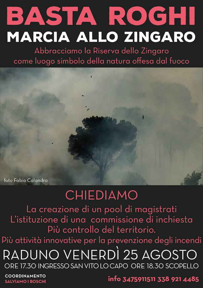 La campagna fa parte di una serie di iniziative, che si svolgeranno in varie città della provincia e che culmineranno in una Marcia allo Zingaro che si svolgerà giorno 25 agosto con due punti di partenza diversi: alle 17:30 dall’ingresso della Riserva lato San Vito, alle 18:30 dall’ingresso di Scopello. I due spezzoni di corteo si uniranno davanti il museo naturalistico per un’abbraccio ideale alla Riserva offesa dagli incendi.