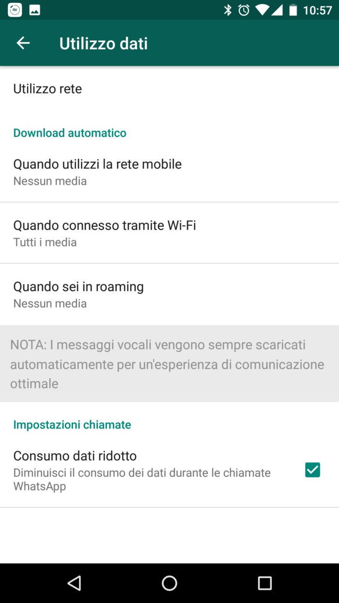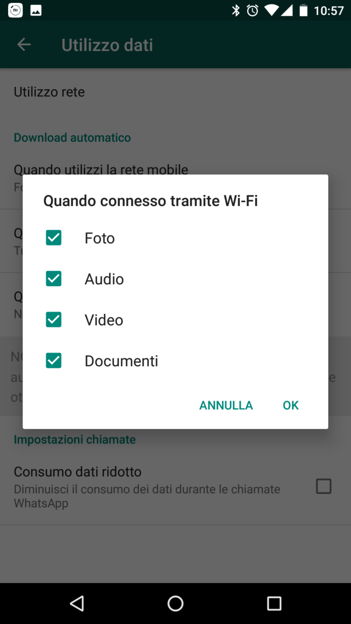 Il consiglio è quello di selezionare il download di Foto, Audio, Video e Documenti solo con connessione Wi-Fi, in modo che non venga mai utilizzata la connessione Dati del cellulare per il download di questi file.
