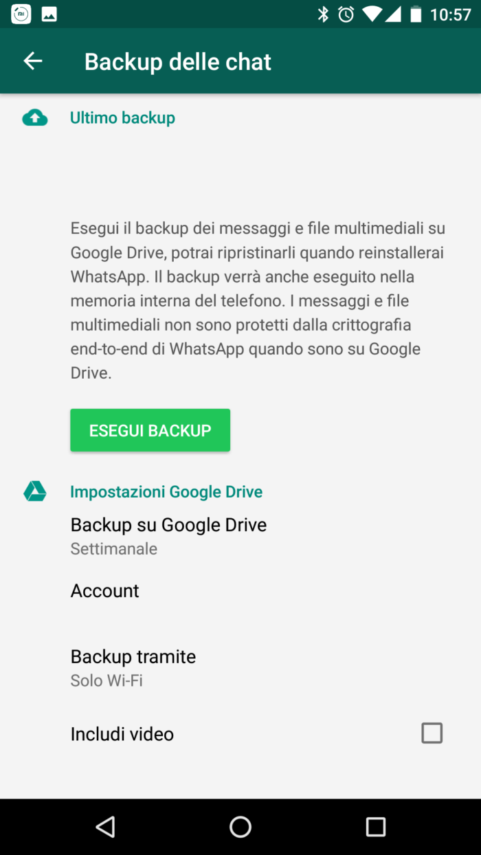 WhatsApp consente di eseguire il backup automatico delle chat. Dunque un punto di ripristino o un’archiviazione delle nostre chat. Per impostazione predefinita il backup viene effettuato solamente tramite Wi-Fi, ma per essere sicuri è meglio andare a controllare che sia effettivamente così, spostandoci in Impostazioni/Chat/Backup delle chat e impostare il backup Solo Wi-Fi.