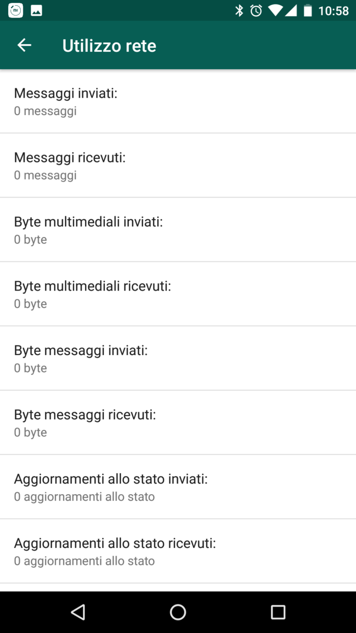 Qui è possibile non solo visualizzare il numero di messaggi inviati e ricevuti, ma bensì controllare il quantitativo di dati scambiati tramite l’applicazione. Per avere una statistica più dettagliata consiglio di azzerare il contatore al prossimo rinnovo dell’abbonamento con il gestore, in modo tale da tenere sotto controllo le statistiche del consumo dell’applicazione.