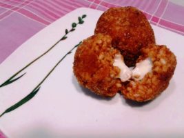 Nel momento in cui il vostro riso apparirà ben asciutto, spegnete la fiamma e mantecate a fuoco spento con burro e parmigiano. Disponete il riso su una spianatoia in modo che raffreddi e, in questo frangente, tagliate a cubetti la vostra mozzarella e lasciatela scolare. Una volta che il riso sarà freddo prelevatene una piccola quantità che disporrete sul palmo della vostra mano. Inserite al centro la mozzarella e aiutandovi con entrambe le mani create una polpetta di riso.