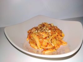 Ho personalizzato la ricetta base aggiungendo una spolverata di pangrattato fresco e mandorle tostati in padella dando un tocco di croccantezza al piatto così da smorzare l’estrema cremosità del sugo.