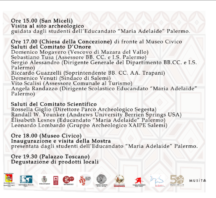 Presenti Domenico Mogavero (Vescovo di Mazara del Vallo), Sebastiano Tusa (Assessore BB. CC. e I.S. Palermo), Sergio Alessandro (Dirigente Generale del Dipartimento BB.CC. e I.S. Palermo), Riccardo Guazzelli (Soprintendente BB. CC. AA. Trapani), Domenico Venuti (Sindaco di Salemi), Vito Scalisi (Assessore Comunale al Turismo), Angela Randazzo (Dirigente Scolastico Educandato “Maria Adelaide” Palermo), Rossella Giglio (Direttore Parco Archeologico Segesta), Randall W. Younker (Andrews University Berrien Springs USA), Élisabeth Lesnes (Educandato ‘”Maria Adelaide” Palermo), Leonardo Lombardo (Gruppo Archeologico XAIPE Salemi).