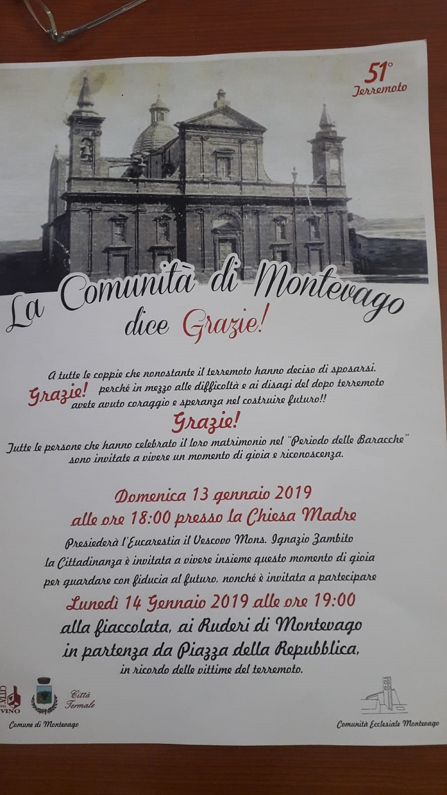 13 gennaio. A Montevago alle 18,00 si riuniranno nella Chiesa Madre, per una messa simbolica di “speranza, coraggio, e gioia” officiata dal Vescovo Ignazio Zambito, tutte le coppie che si unirono in matrimonio nel “periodo delle baracche”, ovvero nei difficili anni del dopo terremoto. Il 14 gennaio alle 19 sempre a Montevago è prevista una fiaccolata in ricordo delle vittime del sisma con partenza da piazza della Repubblica e arrivo ai ruderi del vecchio centro abitato.
